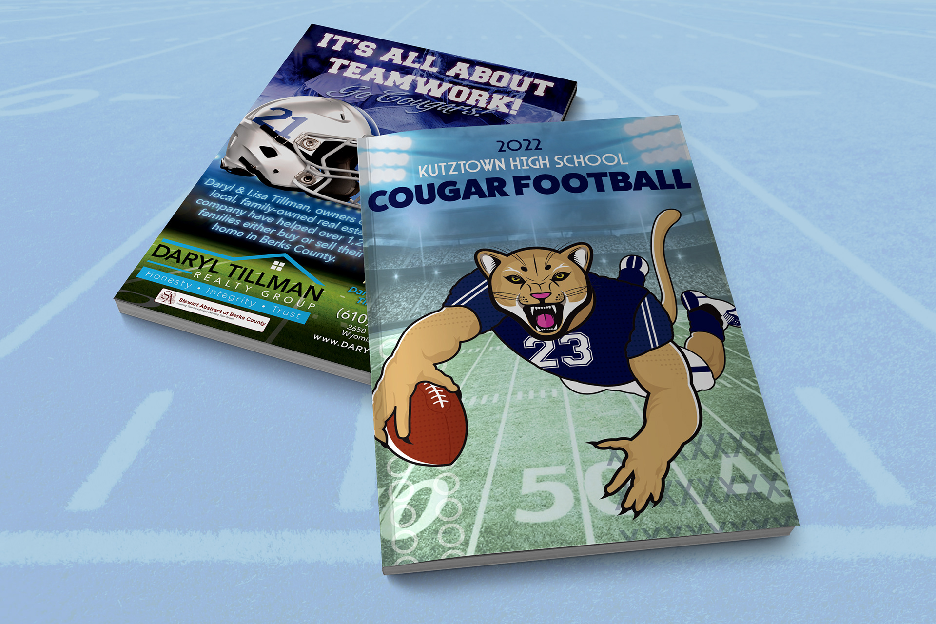Each year, Kutztown High School produces an event book to be sold at home football games. The book highlights the upcoming football season, the football, cheer, and band teams, senior spotlights, coaches’ letters, and advertisements from local businesses and supporters. To keep consistency with Kutztown’s colors, I limited the palette to blue, white, and gold. I also featured a variety of grungy textures to symbolize the teams grit and determination.
